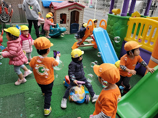 園庭でおもちゃや滑り台でたくさん